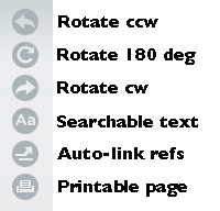 Rotate page. The top three icons are used to rotate the current page image. Sometimes pages are mis-rotated by default, and you can use this tool to correct that problem. Some pages have handwritten marginalia which runs in a different direction than the rest of the page. For whatever reason, these three icons allow you to adjust the orientation to whatever you need.