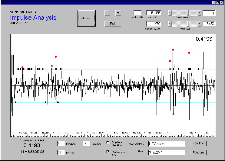 Because I had been interviewed for the show, and many of my graphics were used by the program, the producers sent me a copy of the Sensimetrics report. Their error was immediately obvious. Because the parameter being compared is the echo delay time, it is essential that playback speed of the evidence recording be the same as the original recording speed. In their comparison, Sensimetrics had used the wrong tape speed. The source of the error traces back to the NRC report. The original recording was made on a Dictaphone machine. The DPD playback used in the HSCA analysis was a magnetic tape recording made by playing back the dictabelt on a rented Dictaphone machine. Because these machines were designed for dictation, the playback speed had a variable control making it inevitable that the playback speed would not exactly match the original recording speed. Using the 60 hz motor hum from the original machine, BBN determined that the police recording was made at a playback that was around 5% too fast. But instead of slowing the CH-1 recording, Sensimetrics had sped it up by 5 percent. This is the same mistake made by the NRC panel in their report and may be the origin of Sensimetrics mistake. When I saw the error in the report I sent an e-mail to Robert Berkowitz at Sensimetrics asking for clarification on why he had sped up the recording instead of slowing it down. Without a reply, Berkowitz sent me a disc with his computer program so I could perform the comparison myself.