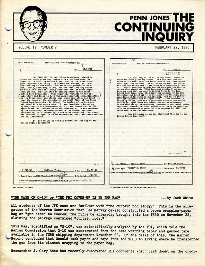 In a 1980 article in Penn Jones Jr.’s conspiracy newsletter, Continuing Inquiry, critic Jack White claimed that the FBI had “sanitized” a document relating to the FBI’s examination of the paper and tape used to construct the bag found in the Depository, and hence, was part of the “cover-up” to hide the truth about the assassination. White reported that two nearly identically worded FBI documents, found by a researcher at the National Archives, offered two opposite conclusions regarding the source of the paper Oswald allegedly used to construct the bag. One version stated that paper samples obtained from the Depository shipping area on November 22 were found to have the same observable characteristics as the brown paper bag recovered from the sixth-floor sniper’s nest. A second version said that the paper samples were found “not to be identical” with the paper gun sack discovered at the scene of the shooting. (Jack White, “The Case of Q-10 or the FBI Cover-Up Is in the Bag”, Continuing Inquiry, February 22, 1980, pp.1–2)