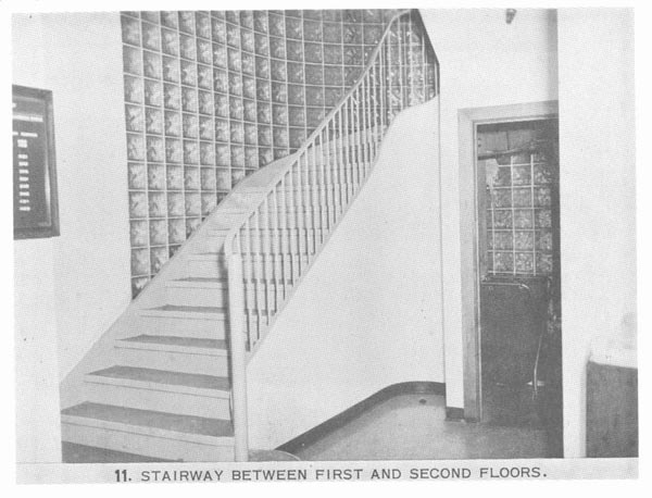 The stairway between the first and second floors near the front entrance of the Book Depository.