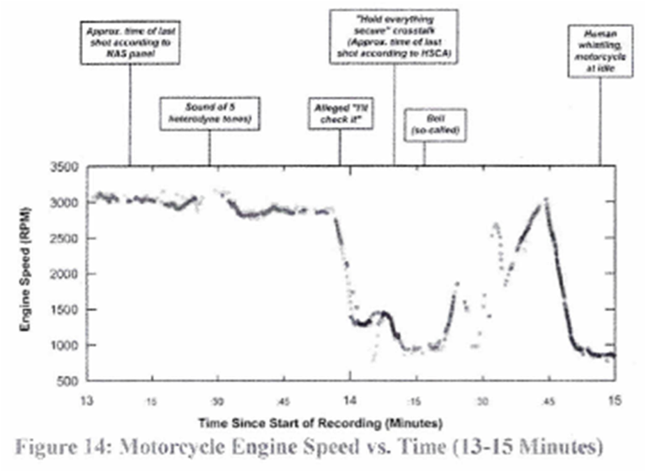 But there is a further consideration. Throughout the report Sonalyst makes reference to “the open microphone,” as if all of the ambient sounds were captured by the one relevant motorcycle. That a succession of microphones were capturing and transmitting sounds need not be stated. Whether Sonalyst knew, or cared not to acknowledge, that multiple microphones were open at the same time is not clear. The most obvious instance occurred when the dispatcher made a broadcast saying, “Attention all emergency vehicles” and the motorcycle motor can be heard humming along in the background. The dispatcher was not riding on the motorcycle, and the motorcycle was not doing wheelies in the communications office. These were two different microphones capturing and transmitting sounds simultaneously. The police radio system acted like a party-line. As long as the capture ratio of competing signals was close to unity they would be simultaneously transmitted. In contrast, the motorcycle motor cannot be heard during the sirens. Sonalyst reasoned that it was “extinguished” by the volume of the sirens. Perhaps so. It is not inconceivable that one or more of the sirens were picked up by a different microphone or microphones. The point is that there are multiple scenarios that explain the siren sounds including but not limited to McLain’s radio. We just don’t know how far behind McLain was when the sirens start. This same party-line capacity could account for the other various bells, whistles, even some of the motorcycle motor noises, that are captured over the system. McLain’s was not the only motorcycle with a radio, nor the only one with a sticky microphone. The problem was indigenous to the Motorola model radios.