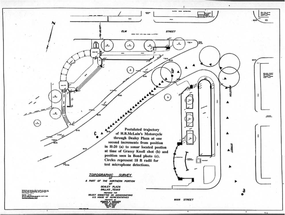 Of the 18 motorcycles in the motorcade the photographic evidence eliminates all but one from being at the acoustically required positions indicated by the circles. Officer H.B. McLain is seen at position (a) before the shooting and at position (c) after the shooting. At approximately 28 sec after the fatal shot McLain is seen at position (c) just passing the parked motorcycle of officer Bobby Hargis. Hargis had stopped his cycle and advanced on the grassy knoll. He returned to his cycle arriving about the same moment that he was passed by McLain. The photo (below) also shows officer J.W. Courson converging at this point. In a film by Elsie Dorman, Courson is seen arriving at the intersection of Elm and Houston at 6 sec after the fatal head shot. He was thus at least 100 ft behind McLain at that time. Because McLain was traveling at idle speed, taking 40 sec to travel 270 ft, Courson quickly closed the gap. When Courson caught up with McLain just after passing Hargis the pair sped up and left Dealey Plaza in tandem. Thus, contrary to the claim that the motorcycle motor speed was inconsistent with the motorcade movements, the movements of McLain’s motorcycle as seen in the films and as required of the acoustical evidence, is a close fit. It is part of the corroborative evidence. Of course, this is not news to those knowledgable of the evidence. What is new is the additional relevant data from Sonalysts analysis. On page 11 the report states, “Divergent data around 14 minutes, 30 seconds suggests that there may be multiple motorcycles heard in this time frame.” This of course is the moment when McLain, Hargis and Courson’s motorcycles converge.