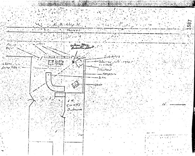 Sketch of Earlene Robert's home, prepared by SA Roger C. Warner, with Robert's position indicated. Click on image to enlarge.
