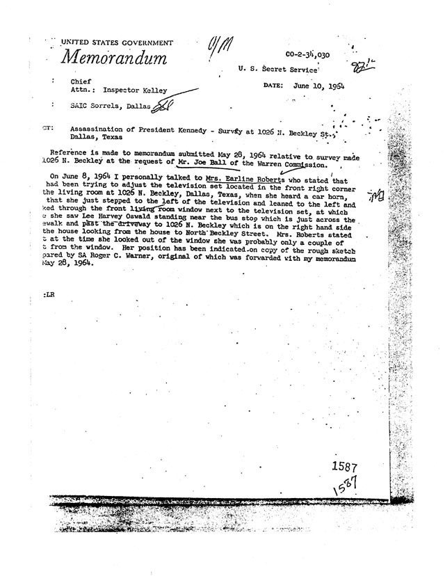 [6]. E. Roberts, affidavit, 7H439; Secret Service interview E. Roberts, and sketch of her sighting scene, SAIC Sorrels to Insp. Kelley, June 10, 1964, CO 2-34, 030.