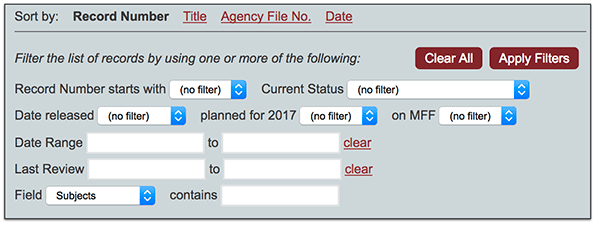 2. use special links at the top of the main page of the Explorer to view all records, all 2017/2018 released records, or just those in the set of withheld-in-full documents planned for release (see below):