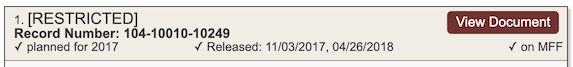 In response to a Freedom of Information Act request by FOIA specialist Michael Ravnitzky, in early 2016 the National Archives provided a 146-page listing of RIF records of documents. These "postponed in full" were scheduled to be released in full in October 2017.