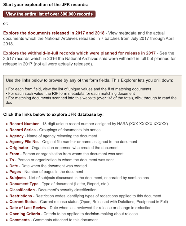 The JFK Database Explorer has a powerful search engine wrapped inside a browse interface. The main page at www.maryferrell.org/php/jfkdb.php presents many ways of getting started: