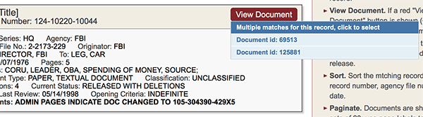 There are also cases where the MFF has more than one copy of a given record. In these cases, the View Document button will provide a menu and allow you to pick which to view. If the document is of particular interest, you may want to view all copies. See the blue menu below the button: