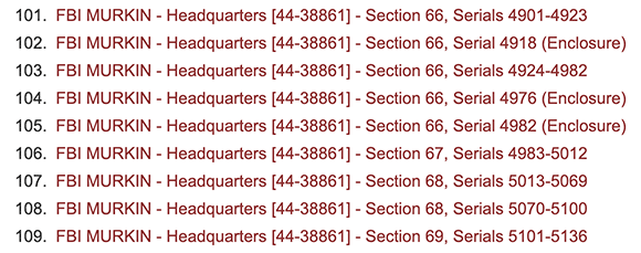 - FBI MURKIN Headquarters Files - the central headquarters files of the MURKIN investigation (59,976 pages in 377 documents)