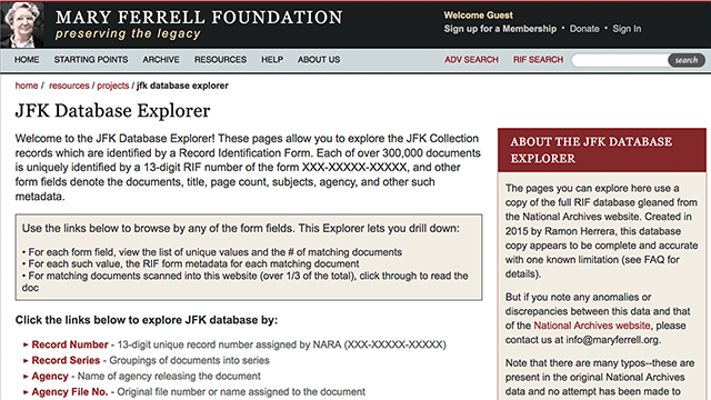 This metadata, by the way, along with metadata for the full collection, is now all available and searchable at maryferrell.org, in a project called the JFK Database Explorer. The metadata cards I'll be showing in this presentation were grabbed off these MFF pages.