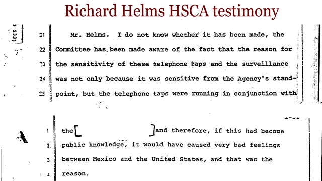 In this page from Richard Helms' testimony to the HSCA, this one short redaction is the name of an agency of the Mexican government, and Helms is telling the Committee that revealing this cooperation would cause "bad feelings between Mexico and the United States." The amount of this stuff - agent names, identification of cooperating foreign governments, intelligence-gathering methods - leads me to wonder whether the CIA in particular, more than the other agencies where these documents come from, may try to stop the 2017 releases.