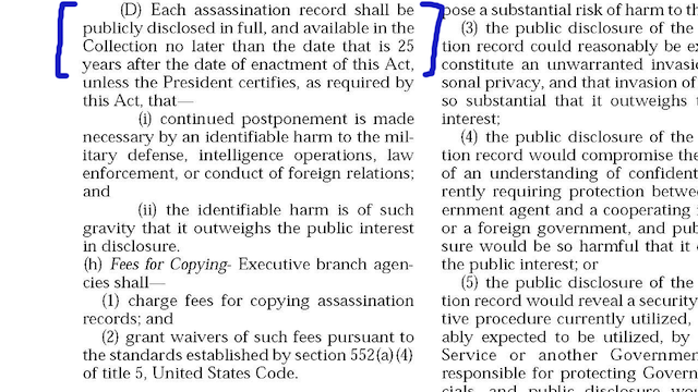 Oh but wait, I forgot to read the rest of the sentence in the JFK Records Act. "Each assassination record shall be publicly disclosed in full.....yadda yadda.....unless the President certifies, as required by this act, that: (i) continued postponement is made necessary by an identifiable harm to the military defense, intelligence operations, law enforcement, or conduct of foreign relations; and (ii) the identifiable harm is of such gravity that it outweighs the public interest in disclosure."