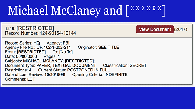 This one is a one-pager whose title is [RESTRICTED], and whose subjects are MICHAEL MCCLANEY and [RESTRICTED]. Many of you may know that McClaney was the owner of the land in Louisiana where an anti-Castro training camp was raided in the summer of 1963.