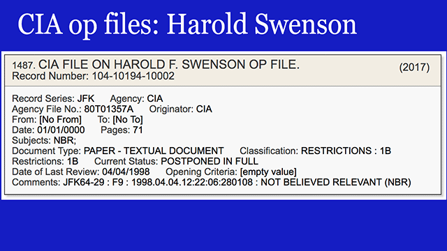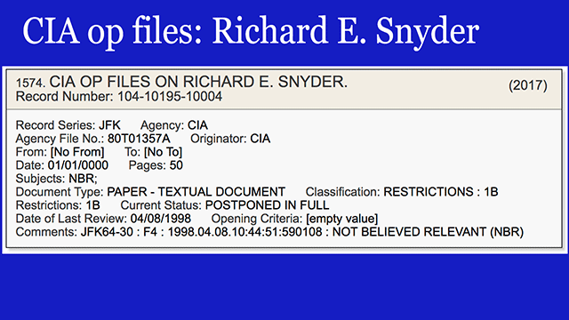 - And there are a number of "OPS files" - operational files - listed under names such as William Harvey [VIEW], David Phillips [VIEW], Ann Goodpasture [VIEW], E. Howard Hunt [VIEW], James O'Connell [VIEW], Harold Swenson [VIEW], and others. Richard Snyder, the U.S. State Department Embassy official in Moscow during Oswald's defection, has a CIA operations file [VIEW]. Curious.