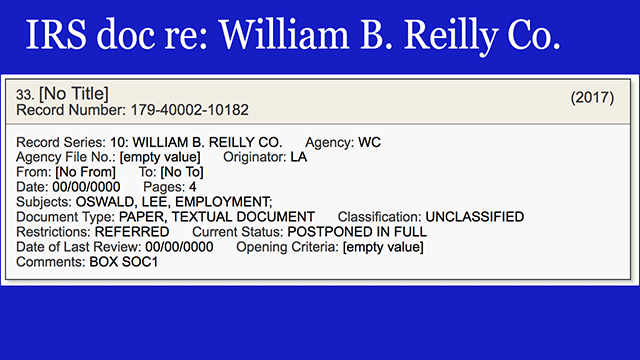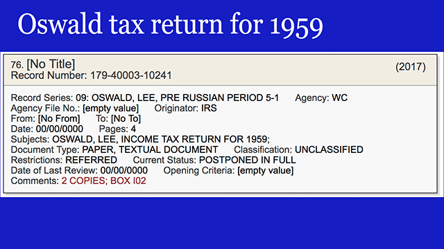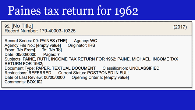 Here are metadata slides for a few of those IRS records. Tax returns for Lee Harvey Oswald - 1959, the Paines - 1962, hmm, here's the William B. Reilly Coffee Company, where Oswald worked in New Orleans.