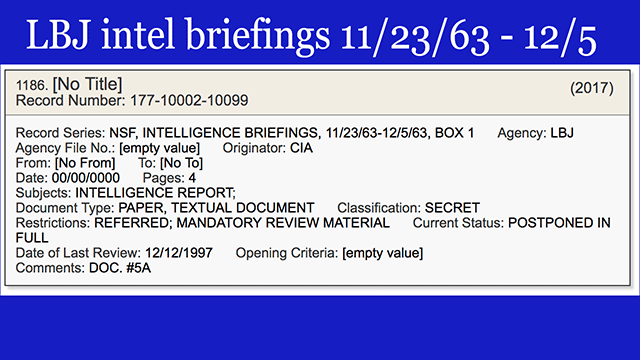 - LBJ's intelligence briefings for two weeks starting the day after the assassination. [VIEW]