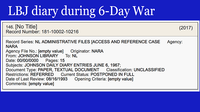 - 15 pages of LBJ's daily diary entries from June 6, 1967, during the 6-day War. [VIEW]