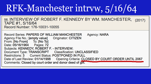 - A transcript of a 1964 interview with Robert Kennedy from the papers of William Manchester. See the note "closed by court order until 2067." Perhaps instead it will be 50 years early? What court order? [VIEW]