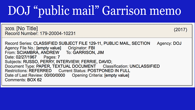 - Here's one of a few Department of Justice documents with "PUBLIC MAIL" in the record series. Is this Garrison memo from a mail intercept, or mailed to them by an inside informant, or what - by what means does "public mail" end up on a copy of a memo from one of Garrison's staff to the DA? [VIEW]