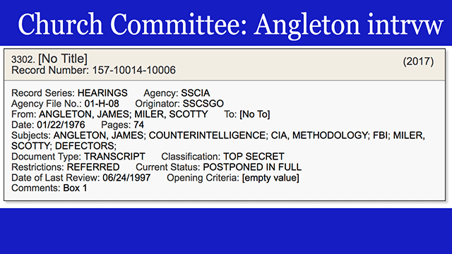 - A few more Church Committee interview transcripts not included in the 1990s releases, including one with none other than CIA CounterIntelligence chief James Angleton. [VIEW]