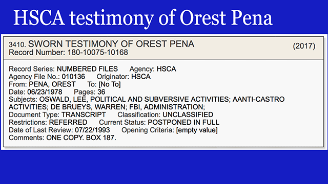 - A transcript of the HSCA interview with Orest Pena, the New Orleans bar owner who told them that Oswald was palling around with the FBI. There are actually 3 copies of this 1978 interview with different RIF numbers - all still withheld in full. [VIEW]