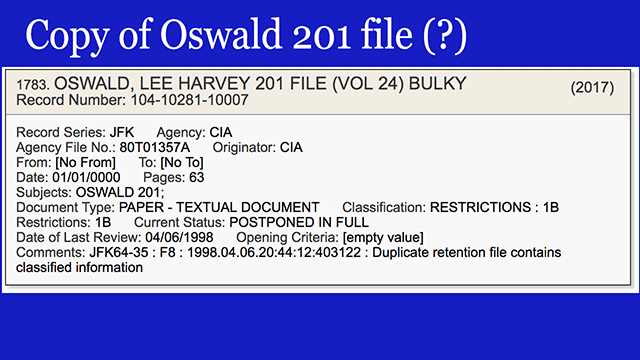 - There are a whole bunch of these volumes of Oswald's 201 file here, withheld in full; they presumably are just copies of what we already have. Though the comment field notes "duplicate retention file contains classified information." [VIEW]