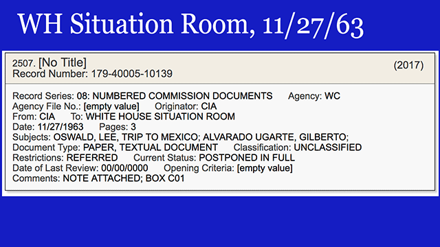 - A still-withheld Warren Commission record, a memo from CIA to the White House Situation Room 4 days after the assassination, regarding the man named Gilberto Alvarado Ugarte who was then telling US and Mexican officials a story that he saw Oswald take money in the Cuban Embassy to kill Kennedy. The timing here is precisely at a point where there are gaps in our understanding of how LBJ turned from being against a Presidential Commission the day before, to being for it a day after, and thus may shed more light on that process. [VIEW]