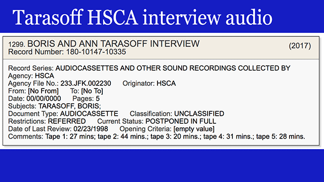 - A taped interview with the Tarasoffs, the CIA translators whose account to the HSCA concerning the so-called "Oswald calls" was at odds with the CIA's narrative. This presumably is a tape of the already-released transcript, but we'll see. Because for one thing there are two different audio interview records. [VIEW]