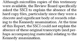But most of the roughly 60 transcripts still missing in February 1998 apparently never made into the ARRB's hands.. The AARB acknowledged the problem in its Final Report, noting that after initially being notified of missing records, "For approximately two years, the SSCI did not explain or rectify this crucial gap in the records provided to NARA." The ARRB, after protracted negotiations, eventually obtained direct access to "all 450 boxes of original Church Committee files" and "inspected all the original files...However, the hard copy of testimony cited in the JFK Assassination Report was not among the materials" (only microfilmed copies of some of them). The compliance section of the AARB's Report concluded "At the time of this Report, the SSCI coud not explain the absence of these original transcripts (and perhaps accompanying materials) relating to the Kennedy assassination."
