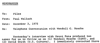 Roache also offered the name of another INS employee, Ronald L. Smith. Six days later, Wallach wrote up a phone call he had with Mr. Smith, who recalled in April of 1963 having "interrogated a prisoner....named Lee Harvey Oswald." While Smith did not want to testify, claiming "he would have nothing to add," the same does not appear to be true of Roach, or possibly other people whose names were raised in these calls, including a David Smith of Customs.